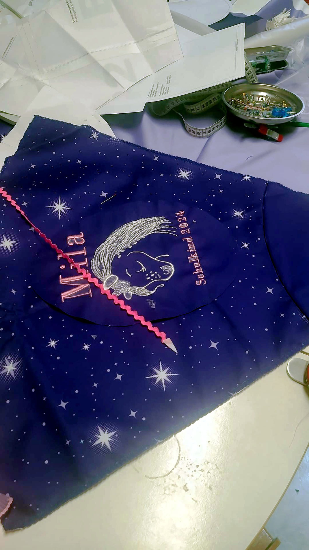 Die Stoffauswahl der Tüte kann direkt vor Ort besprochen werden oder auch mit dem direkt zu dem Ranzen gehörendem Stoff gefertigt werden. (Das setzt unter Umständen aber auch Mehrkosten voraus. ) Auch die Stickauswahl kann gerne telefonisch, nach Absprache vor Ort oder per Whatsapp besprochen werden.